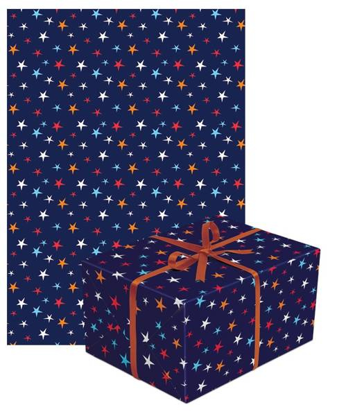 Zdobiony kolorowymi gwiazdkami na granatowym tle.