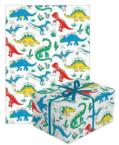 Zdobiony kolorowymi dinozaurami na tle kratki.
