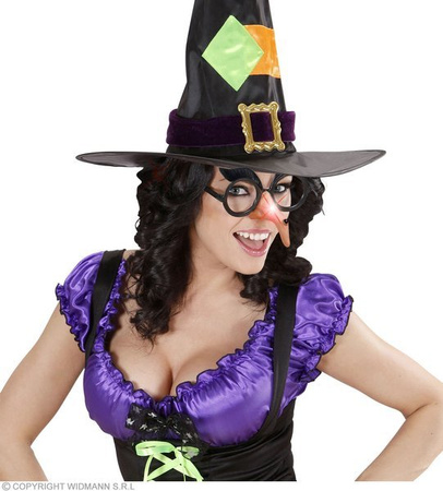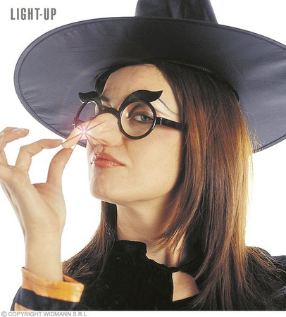 Okulary z z nosem czarownicy. Oprawki z brwiami: czarne, plastikowe. Nos: sylikonowy z zamontowaną czerwoną diodą.