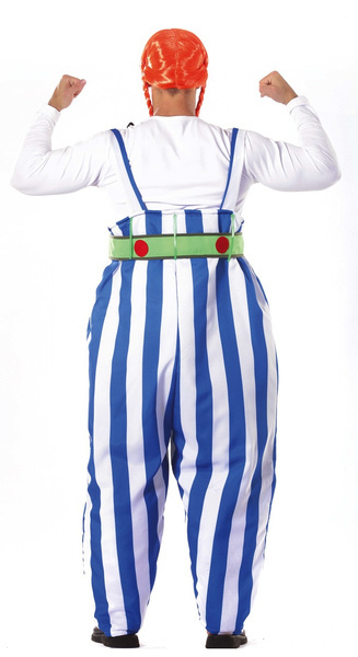 Spodnie na szelkach w biało-niebieskie pionowe pasy.