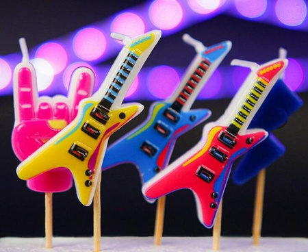 ŚWIECZKI NA TORT (PIKERY) W KSZTAŁCIE GITAR Kolor: różnokolorowy Wzór: gitary, błyskawica Wysokość świeczek: ok. 4 cm Wysokość całkowita (z patyczkiem): ok. 8 cm Ilość sztuk w opakowaniu: 5 Producent: Godan S.A