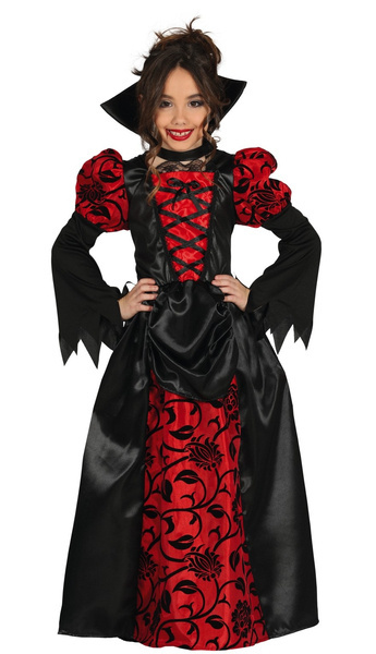 Czarna suknia z bogatym zdobieniem w kolorze czerwonym.