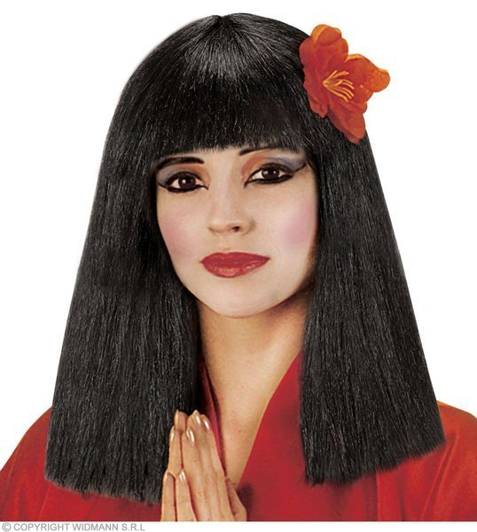 Peruka w kolorze: czarnym. Włosy proste, równo cięte. Na boku wpięty kwiat. Peruka mocowana na elastycznej siatce. Stylizowane na Chinkę.