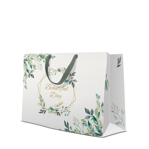 Torba prezentowa z nadrukiem liści i metalizowanym napisem Beautiful Day.