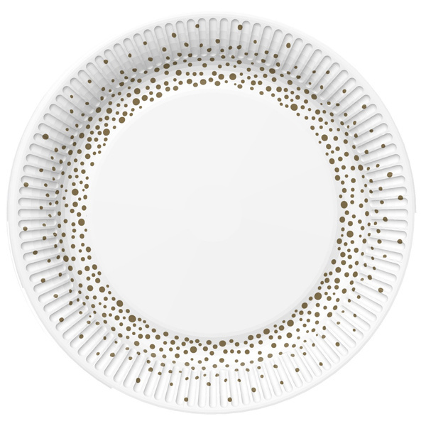 Talerzyki papierowe w kolorze białym ze złotymi kropkami.