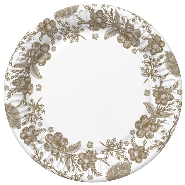 • Talerzyki papierowe w kolorze białym ze złotymi kwiatami.