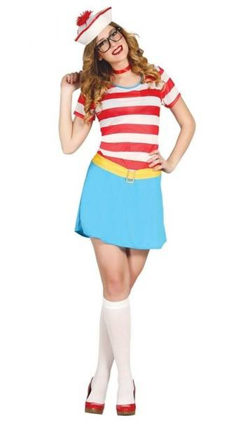 Góra sukienki w biało-czerwone paski, dół w kolorze błękitnym.