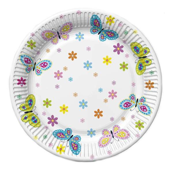Talerzyki papierowe z nadrukiem kolorowych motyli i kwiatów.