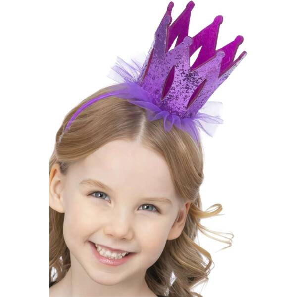 Opaska w kolorze fioletowym ozdobiona materiałową koroną.