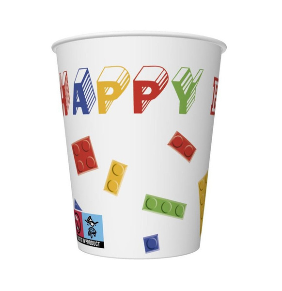 Kubeczki papierowe z nadrukiem klocków i napisem Happy Birthday.