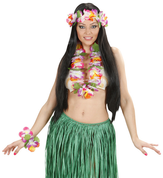 Biżuteria hawajska wykonana z kwiatów w kolorze fioletowo-różowo-pomarańczowych, nawleczonych na gumkę.