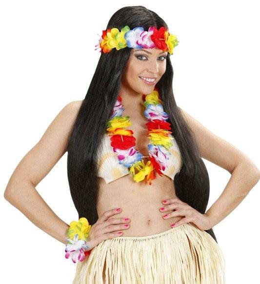 Biżuteria hawajska wykonana z kolorowych kwiatów nawleczonych na gumkę.