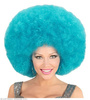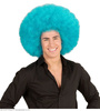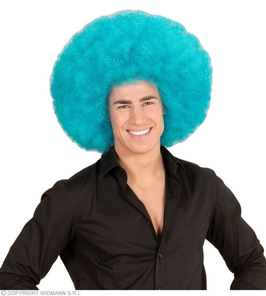Peruka w kolorze: niebieskim. Włosy kręcone, nastroszone, ułożone w bardzo duże afro. Mocowana na elastycznej siatce. Włosy są błyszczące.