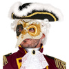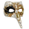 Ozdobna maska wenecka z efektem pęknięcia. Lakierowana powierzchnia, wypukłe zdobienia. Kolor beżowy z czarnymi i złotymi elementami.