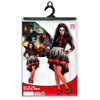 Sukienka w kolorze czarno-czerwonym. Rękawy wykończone czarną koronką. Wkładana przez głowę, zapinana z tyłu na rzep. Na klatce piersiowej nadruk szkieletu. Spódniczka asymetryczna (dłuższy tył). Dodatkowo zdobiona poszarpanym materiałem. Opaska na głowę z kwiatami i czarnym koronkowym welonem z wzorem róż.