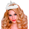 Tiara-opaska księżniczki wykonana z solidnego srebrnego tworzywa sztucznego. Zdobiona małymi kamyczkami oraz białym puszkiem. Opaskę należy wsunąć we włosy.