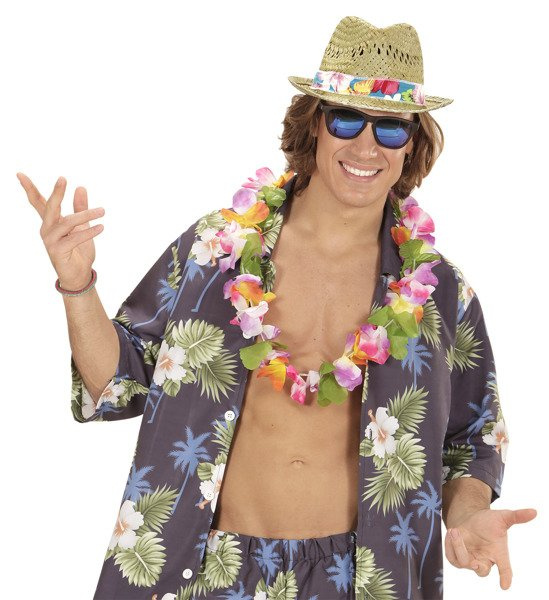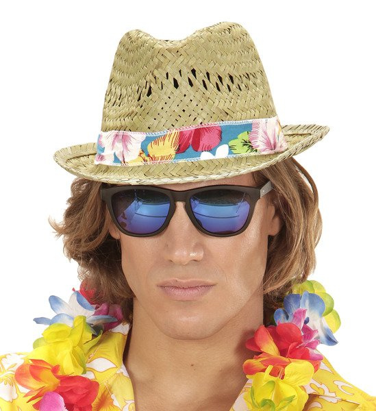 Kapelusz słomkowy fedora zdobiony kwiatową tasiemką.