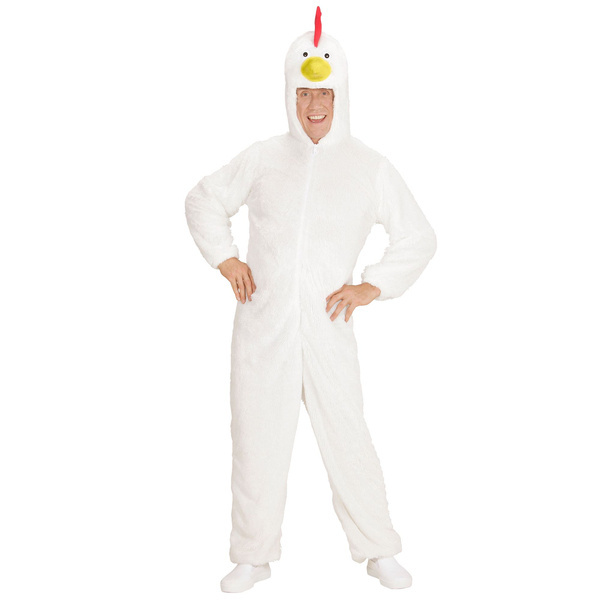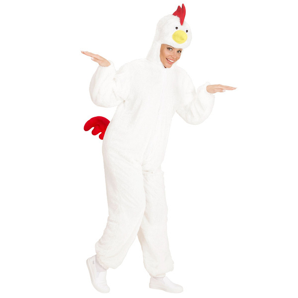 Do kombinezonu doszyty jest kaptur z głową kurczaka.