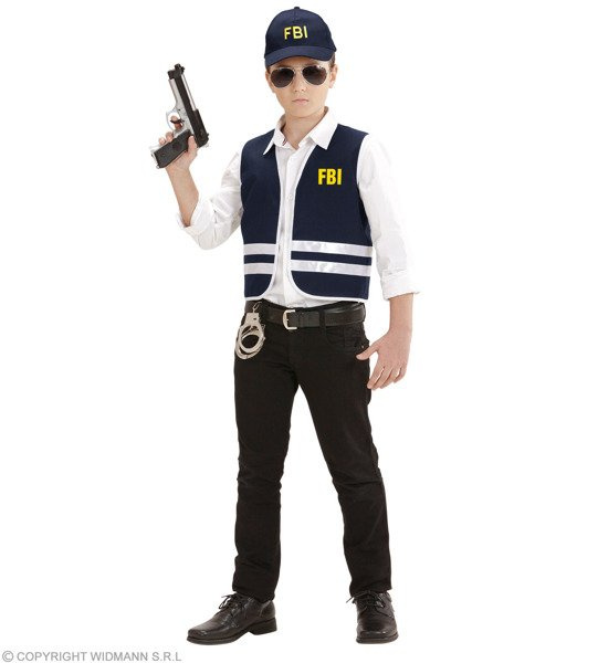 Granatowa kamizelka z białymi paskami i żółtym napisem FBI na piersi i na plecach.