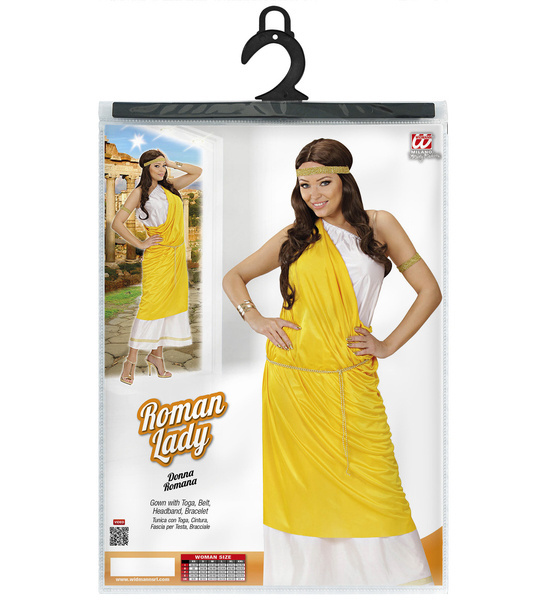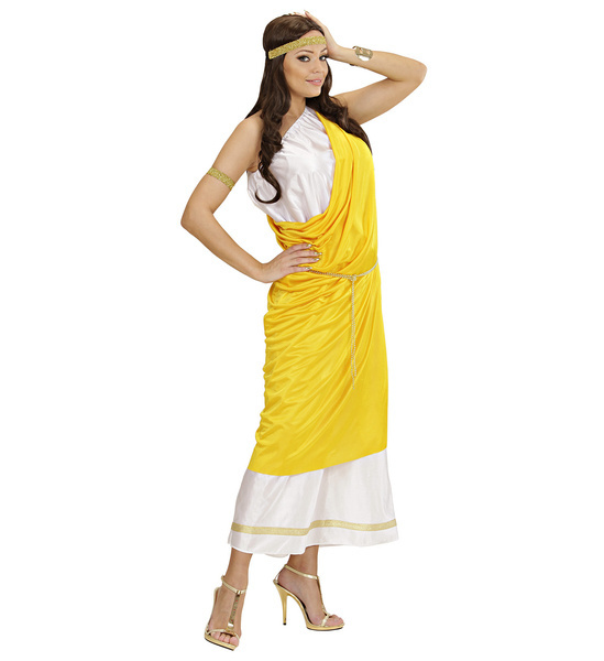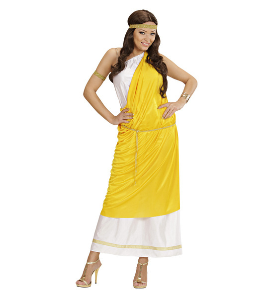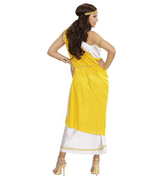 Sukienka w kolorze białym, ze złotą lekko mieniącą się togą. Złoty pasek do przewiązania sukienki. Opaska na głowę na gumce oraz bransoletka w kolorze złotym.