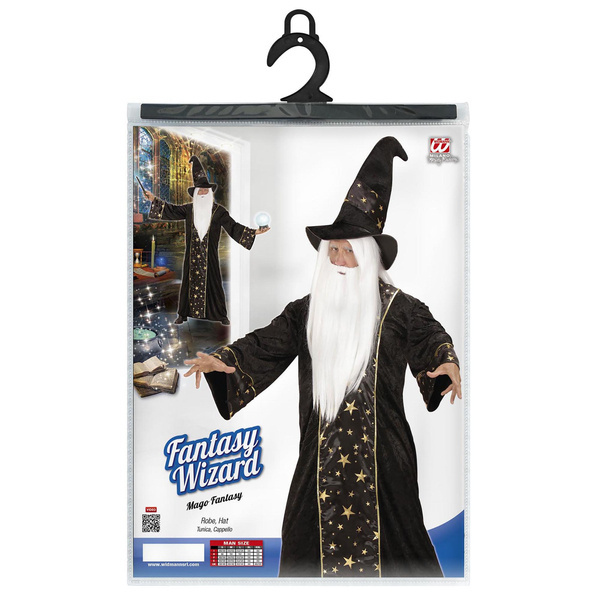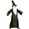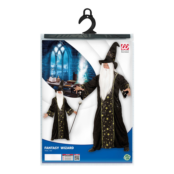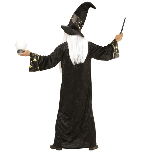 Szata z szerokimi rękawami, wykończona złotym pasem i gwiazdkami. Kapelusz maga wykonany z pianki obszytej welurowym materiałem z gwiazdkami.