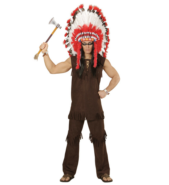 Strój w kolorze brązowym zdobiony frędzlami. Spodnie na gumce w pasie.