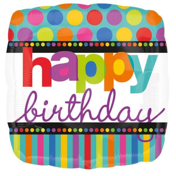 Kolorowy balon foliowy w paski i groszki z napisem Happy Birthday.