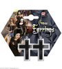 Kolczyki w kształcie krzyża w kolorze czarno-srebrnym. Kolczyki mają silikonowe zatyczki.