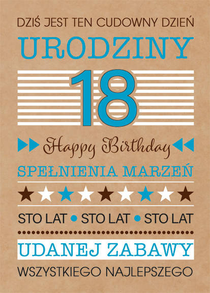 Kartka na osiemnaste urodziny z ekologicznego papieru. Posiada napisy: 18, Happy Birthday, Sto lat.