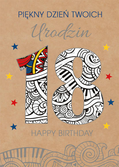 • Kartka na osiemnaste urodziny z ekologicznego papieru. Posiada duży napis "18".