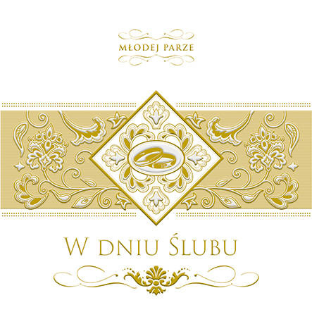 Kartka na ślub ze złotym wzorem i obrączkami. W środku kartki znajduje się sentencja z życzeniami.