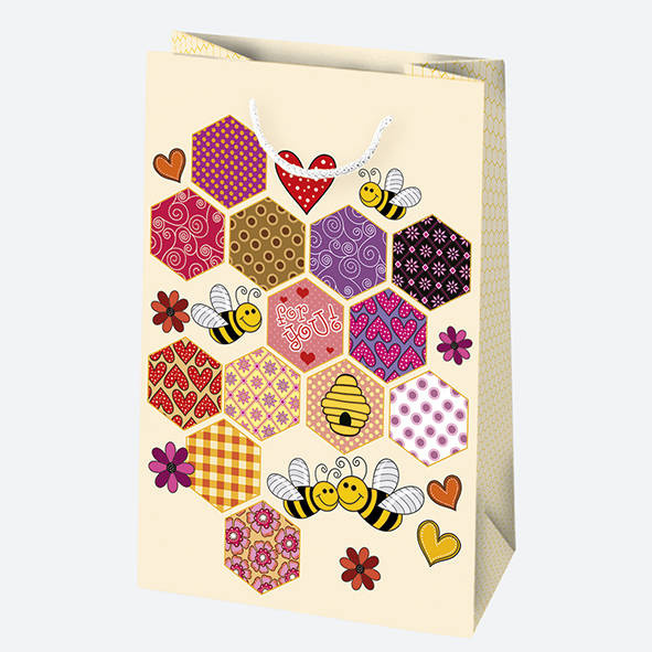 Z motywem dziecięcym - pszczółki, plastry miodu, serduszka na żółtym tle.