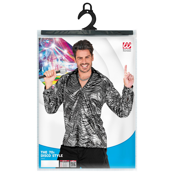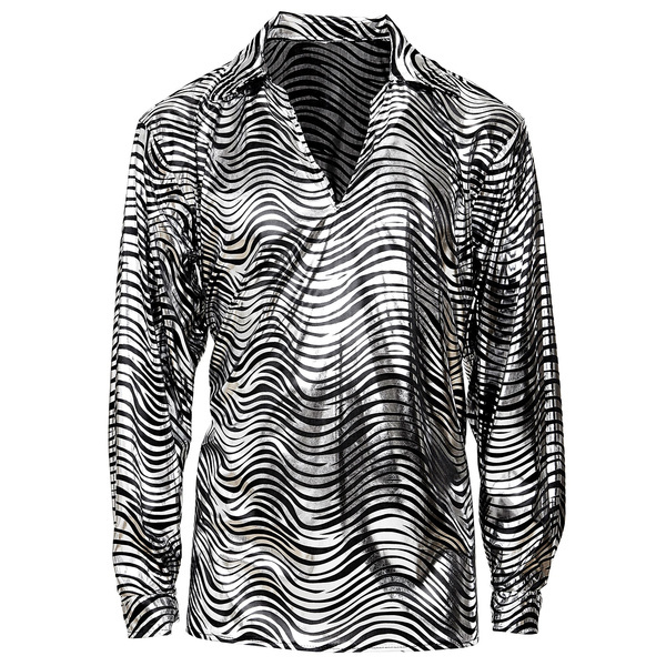 Koszula męska disco, lata 70. Wzór: fale. Kolor: czarno-srebrny. Skład: 100 % poliester.