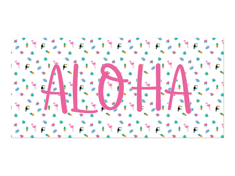 Różowy napis Aloha oraz mix wzorów w tle: ananas, flaming, tukan, liście.
