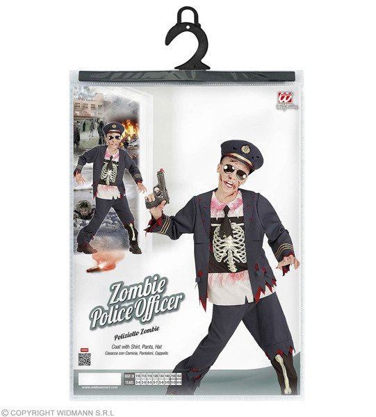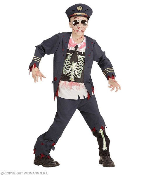 Granatowa marynarka z biało-czarną koszulą z krawatem, plamami krwi i nadrukiem szkieletu.
