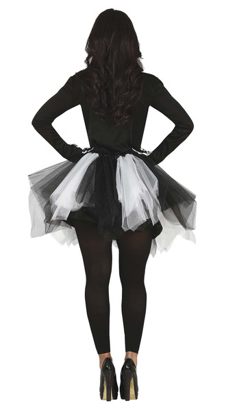 Dół wykonany z czarnego i białego tiulu, ozdobiony brokatem.