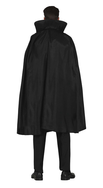 Czarny długi płaszcz z usztywnionym kołnierzem.