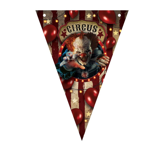 W kształcie flag z nadrukiem mrocznego cyrkowego klauna.