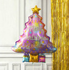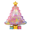 Balon foliowy w kształcie choinki z gwiazdą na czubku oraz prezentami.