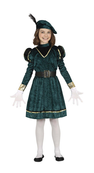 Sukienka ozdobiona czarnym materiałem i złotymi tasiemkami.