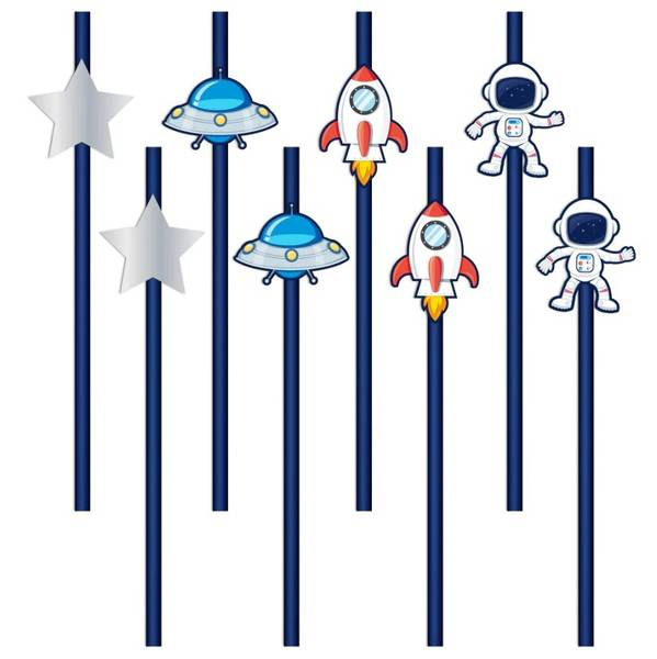 Słomki papierowe z dekoracjami o tematyce kosmicznej.