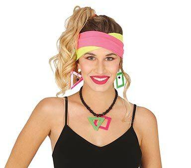 - naszyjnik z czarnych koralików dodatkowo ma dwie neonowe zawieszki zielony trójkąt, różowy kwadrat,