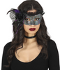 Zdobiona różą w kolorze czarnym oraz fioletowymi piórkami.