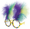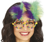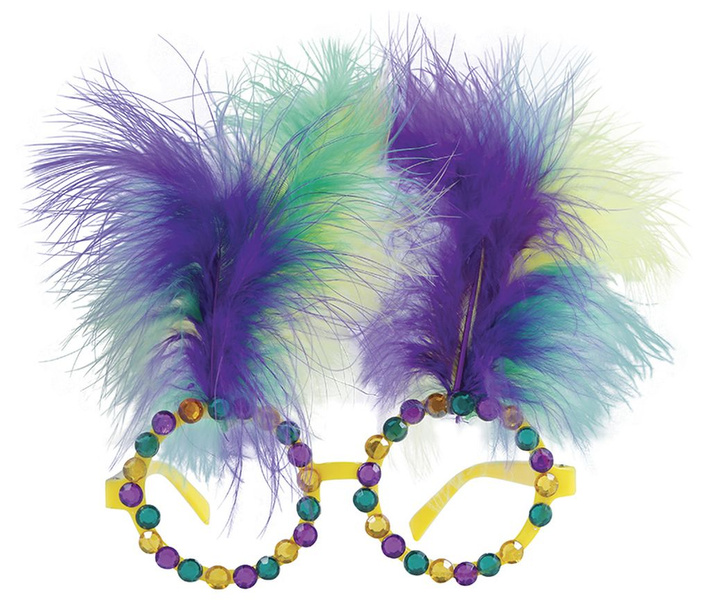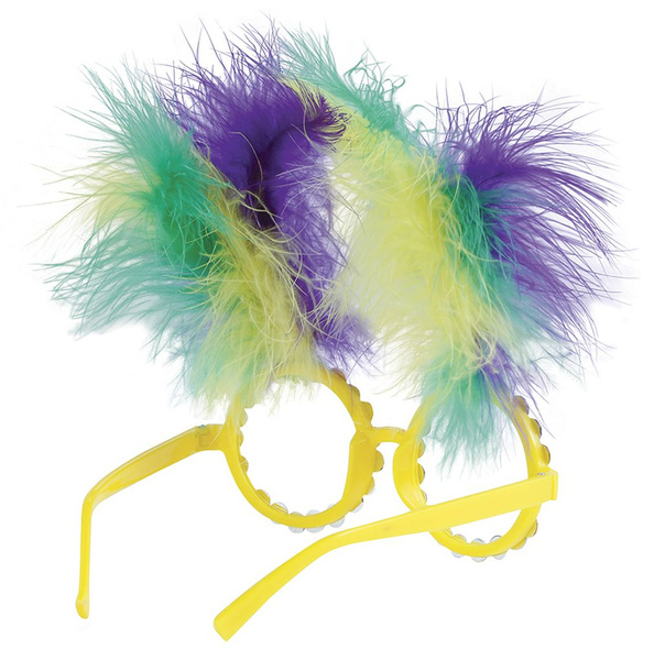 Okulary w kolorze żółtym zdobione piórami oraz kamyczkami.