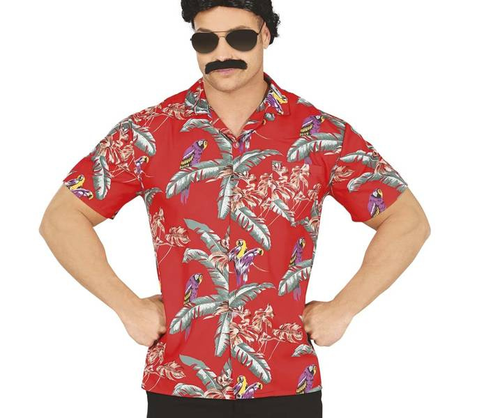 W kolorze czerwonym w kolorowe palmy i papugi.