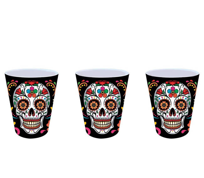 Kubeczki z motywem kwiatowym i czaszkami.