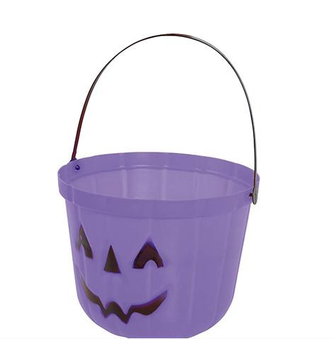 Wiaderko w kolorze fioletowym z nadrukiem uśmiechniętej miny.