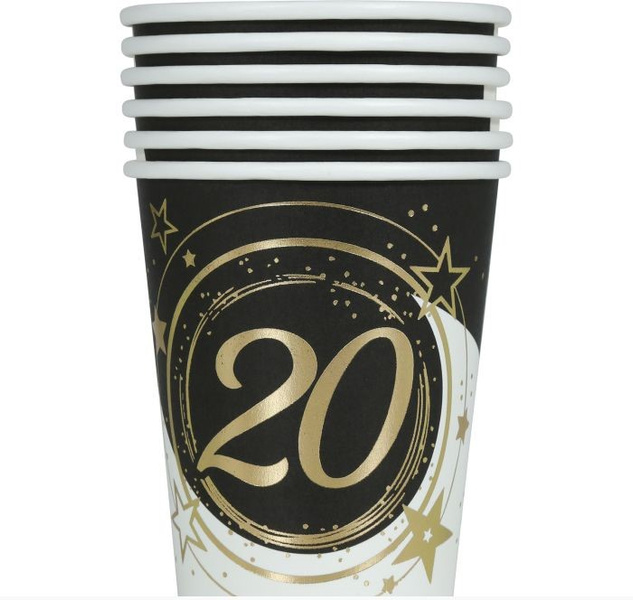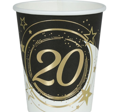 Kolor: czarno-biały ze złotą liczbą 20 i gwiazdkami.