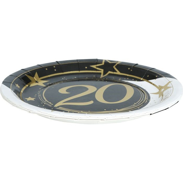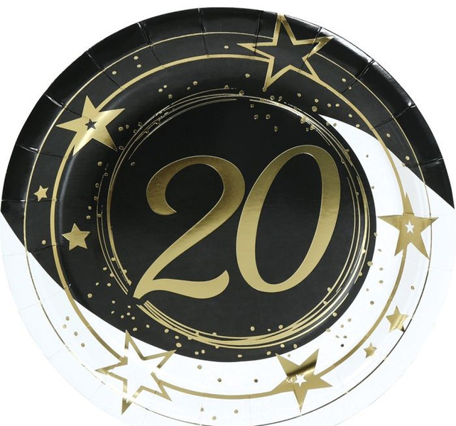 Kolor: czarno-biały ze złotą liczbą 20 i gwiazdkami.