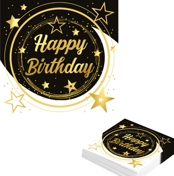Eleganckie Serwetki Urodzinowe – Złote Gwiazdki i Napis „Happy Birthday”.